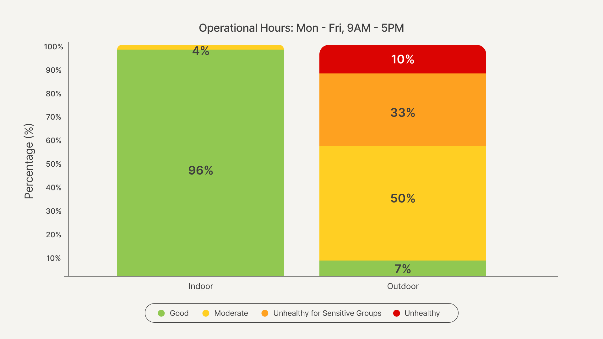 To ground this in a specific moment, June 2025 was a clearly difficult month, with 47 µg/m³ outdoor PM2.5. In conditions like that, protecting healthy indoor air becomes a practical leadership decision, creating a stable environment for people to work, even when the city outside is not stable.