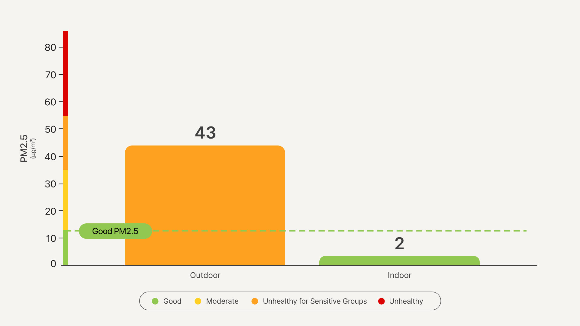 During this period, outdoor PM2.5 averaged 43 µg/m³, a level considered unhealthy for sensitive groups. Meanwhile, indoor PM2.5 inside the studio was only 2 µg/m³, indicating very clean air conditions.