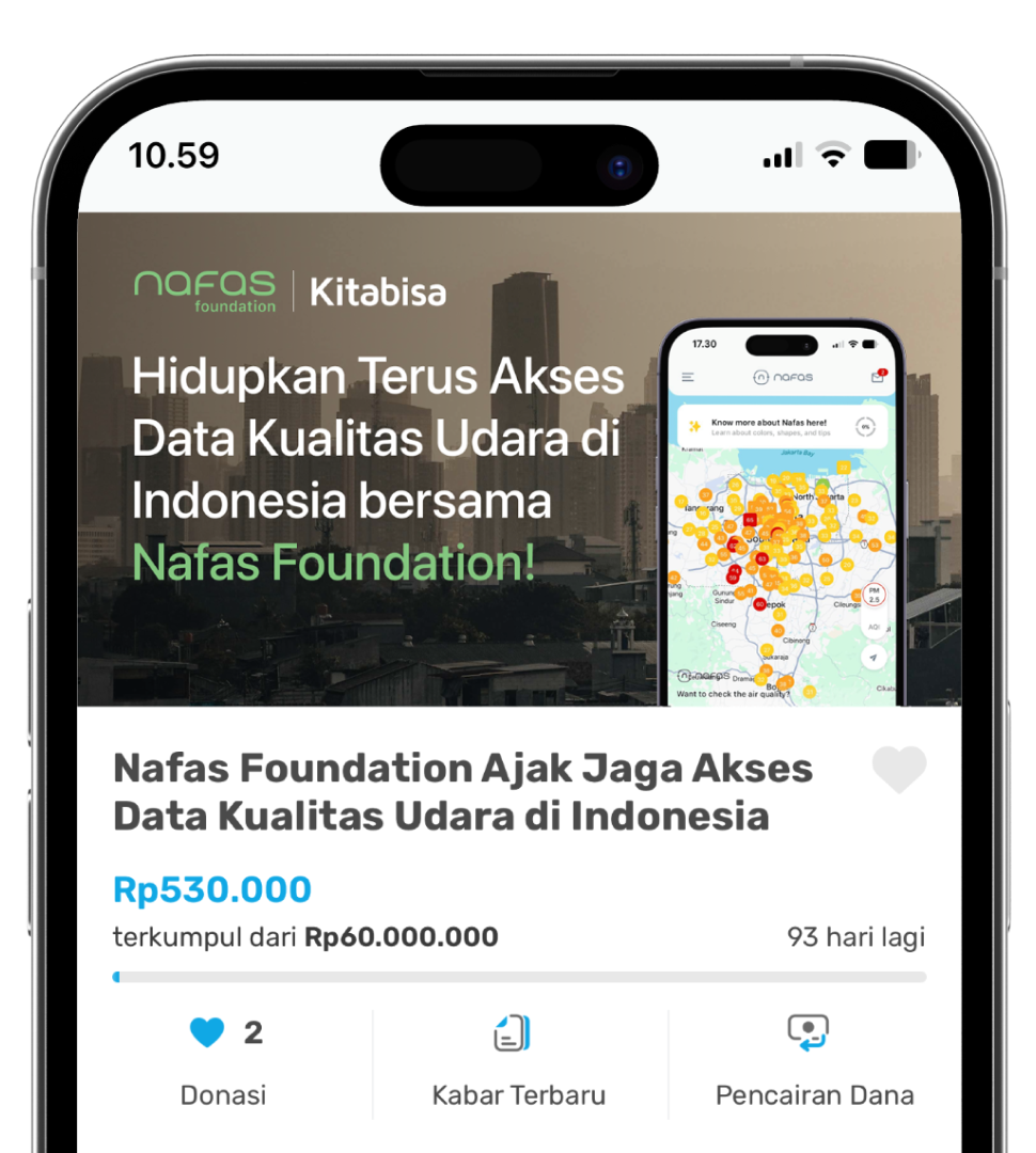 Bantu Nafas Foundation melanjutkan misinya menyediakan data kualitas udara real-time dan lokal yang bisa diakses gratis di seluruh Indonesia. Kamu dapat berdonasi, dan seluruh dana akan memastikan jaringan kualitas udara independen tetap tersedia bagi semua orang, tanpa biaya.